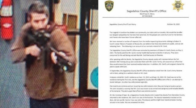ABD’nin Maine eyaletinde Robert Card adlı silahlı saldırgan, 18 kişinin ölümüne ve 13 kişinin yaralanmasına neden olduktan sonra kaçmış, güvenlik güçleri Card'ı iki gün sonra ölü olarak bulduklarını duyurmuştu. Maine eyaletindeki Sagadohoc kenti Şerifi Joel Merry, dün yaptığı açıklamada Card’ın ailesinin 5 ay önce kendilerine ulaştığını, onun akıl sağlığı problemlerinden ve silahlara erişiminden endişelendiklerini aktardı.