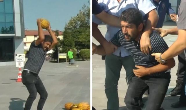 Açıklamalarının ardından, zabıtalara kavunlarının nerede olduğunu soran ancak yine yanıt alamayan Koyuncu, öfkelenerek yanında getirdiği kavunları belediye binası önünde kırmaya başladı. Bunun üzerine çevrede güvenlik önlemi alan polis ve zabıta ekipleri, Koyuncu'yu gözaltına aldı. Zabıta ekipleri o anları kayda almaya çalışan basın mensuplarına da engel olmaya çalıştı. Belediye önünde yaptığı eylemin ardından gözaltına alınan Koyuncu, serbest bırakıldı.